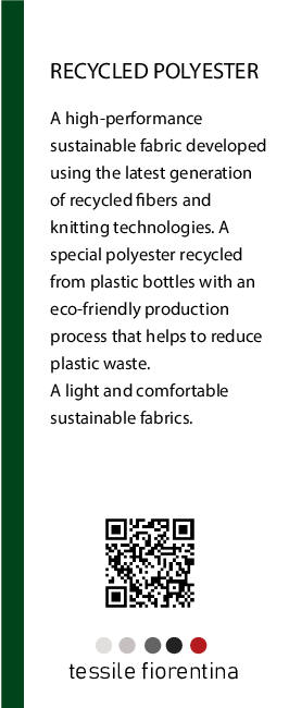 TESSUTO SOSTENIBILE AD ALTE PRESTAZIONI SVILUPPATO UTILIZZANDO FIBRE RICICLATE E TECNOLOGIE DI LAVORAZIONE A MAGLIA. UN POLIESTERE SPECIALE RICICLATO DA BOTTIGLIE DI PLASTICA CON UN PROCESSO DI PRODUZIONE ECOLOGICO CHE AIUTA A RIDURRE I RIFIUTI DI PLASTICA. SOSTENIBILE, LEGGERO E CONFORTEVOLE.