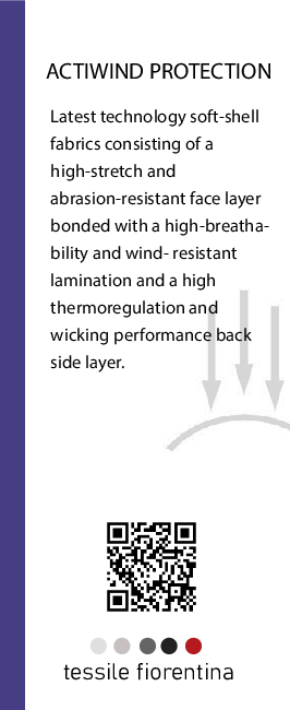 TESSUTO SOFT-SHELL DI ULTIMA TECNOLOGIA, COSTITUITO DA UNO STRATO FRONTALE ALTAMENTE ELASTICIZZATO E RESISTENTE ALL’ABRASIONE UNITO AD UNA LAMINAZIONE AD ALTA TRASPIRABILITÀ; RESISTENTE AL VENTO E AD UN’ELEVATA REGOLAZIONE TERMICA CON PRESTAZIONI TRASPIRANTI SUL RETRO.
