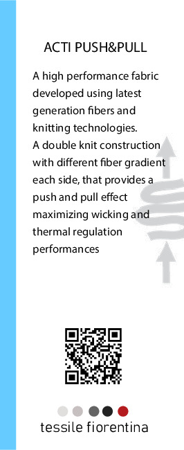 UN TESSUTO AD ALTE PRESTAZIONI SVILUPPATO UTILIZZANDO FIBRE DI ULTIMA GENERAZIONE E TECNOLOGIE DI LAVORAZIONE A MAGLIA. UNA COSTRUZIONE A DOPPIA MAGLIA CON UN GRADIENTE DI FIBRE DIVERSE SU CIASCUN LATO, CHE FORNISCE UN EFFETTO PUSH-AND-PULL MASSIMIZZANDO LE PRESTAZIONI DI ASSORBIMENTO DELL’UMIDITÀ E DI REGOLAZIONE TERMICA.