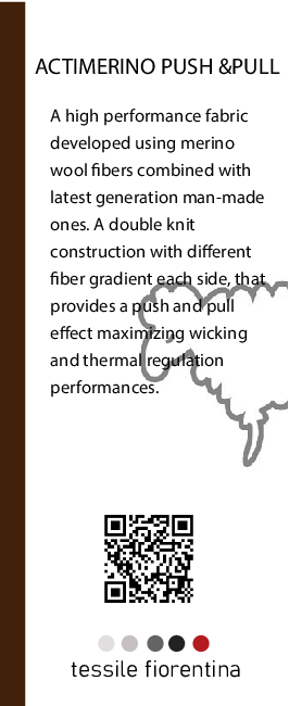UN TESSUTO AD ALTE PRESTAZIONI SVILUPPATO UTILIZZANDO FIBRE DI LANA MERINO COMBINATE CON QUELLE ARTIFICIALI DI ULTIMA GENERAZIONE. UNA COSTRUZIONE A DOPPIA MAGLIA CON DIVERSI GRADIENTI DI FIBRA SU CIASCUN LATO, CHE FORNISCE UN EFFETTO DI SPINTA E TRAZIONE MASSIMIZZANDO LE PRESTAZIONI DI ASSORBIMENTO E REGOLAZIONE TERMICA.