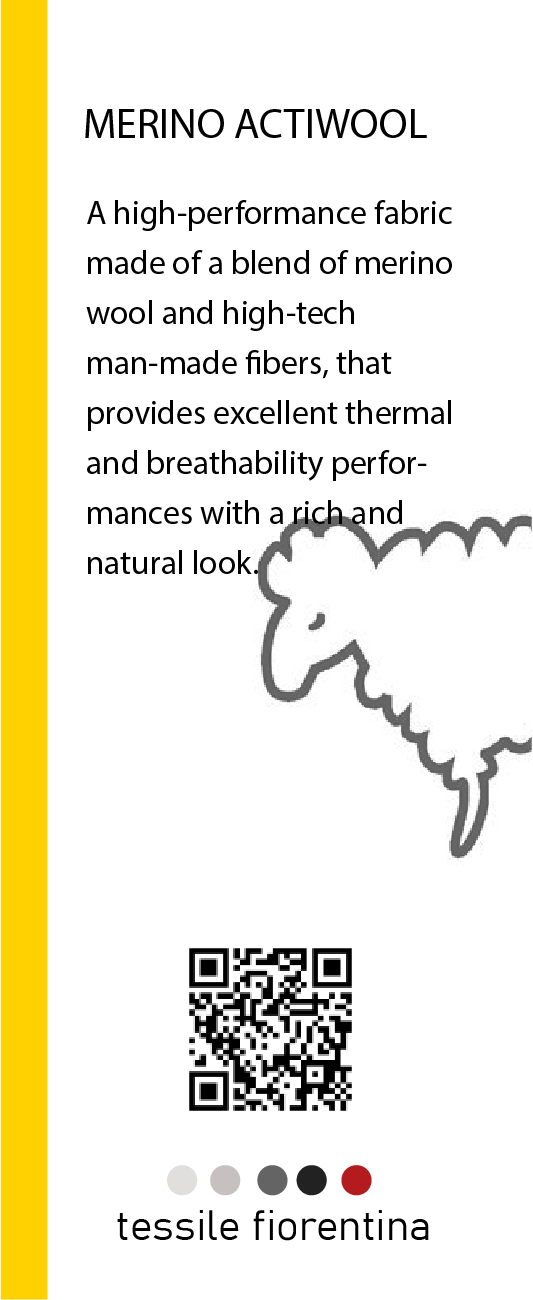 A HIGH-PERFORMANCE FABRIC MADE OF A BLEND OF MERINO WOOL AND HIGH-TECH MAN-MADE FIBERS, THAT PROVIDES EXCELLENT THERMAL AND BREATHABILITY PERFORMANCES WITH A RICH AND NATURAL LOOK.