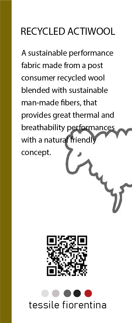 A SUSTAINABLE PERFORMANCE FABRIC MADE FROM A POST CONSUMER RECYCLED WOOL BLENDED WITH SUSTAINABLE MAN-MADE FIBERS, THAT PROVIDES GREAT THERMAL AND BREATHABILITY PERFORMANCES WITH A NATURAL FRIENDLY CONCEPT.