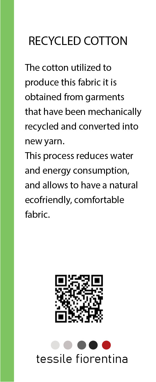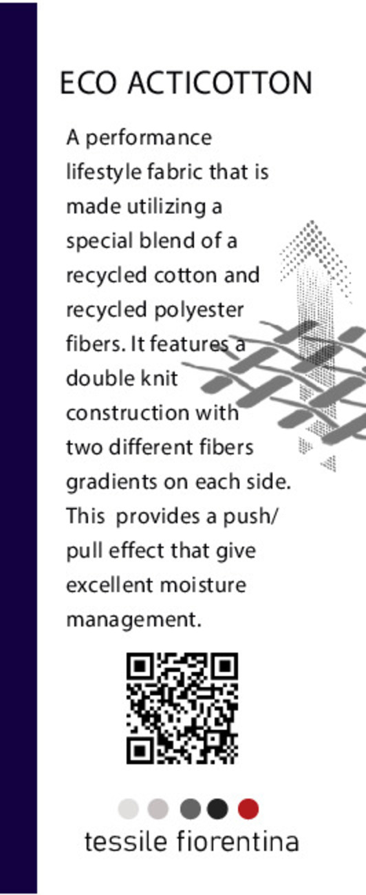 A PERFORMANCE LIFESTYLE FABRIC THAT IS MADE UTILIZING A SPECIAL BLEND OF A RECYCLED COTTON AND RECYCLED POLYESTER FIBERS. IT FEATURES A DOUBLE KNIT CONSTRUCTION WITH TWO DIFFERENT FIBERS GRADIENTS ON EACH SIDE. THIS PROVIDES A PUSH/PULL EFFECT THAT GIVE EXCELLENT MOISTURE MANAGEMENT.